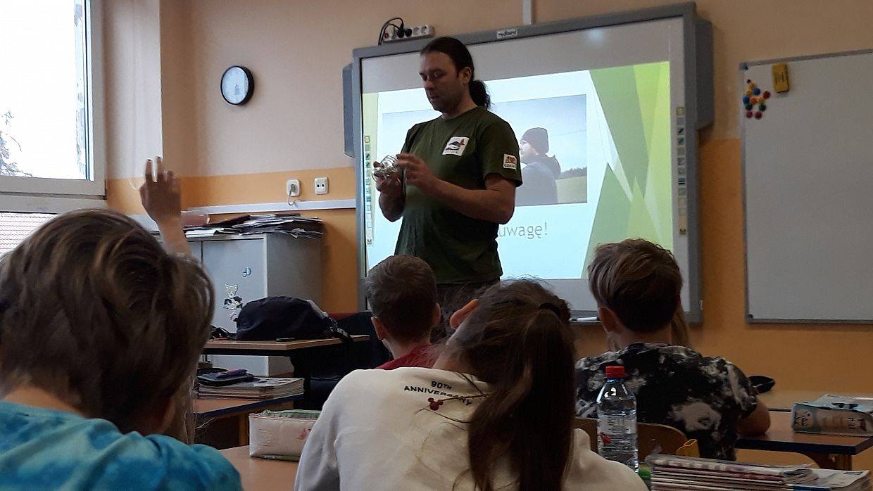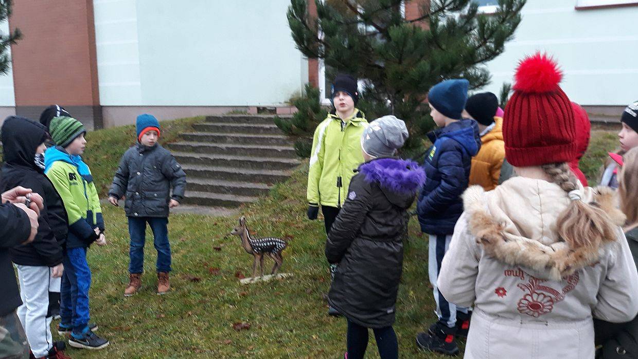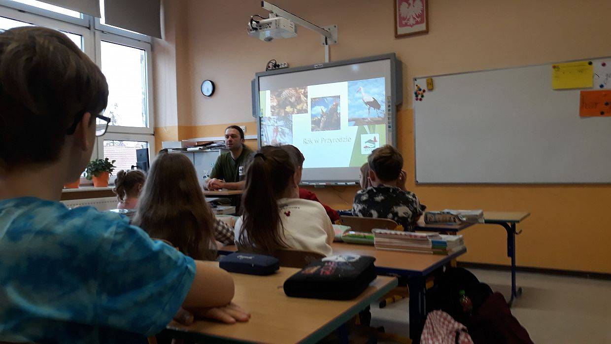 Uczniowie klas młodszych mieli możliwość poszerzenia swojej wiedzy na temat postępowania z dzikimi zwierzętami podczas zajęć z pracownikiem Pomorskiego Ośrodka Rehabilitacji Dzikich Zwierząt „Ostoja”. Na podstawie prezentacji pt. „Rok w przyrodzie” opowiadał dzieciom, na jakie zagrożenia narażone są dzikie zwierzęta w poszczególnych porach roku oraz jak można im w tych sytuacjach pomóc. Uczniowie dowiedzieli się m. in. jakie są zasady dokarmiania ptaków zimą, jakie zachowania jeża świadczą o tym, że dzieje się z nim coś złego, jak powinni postąpić, gdy znajdą młodego zająca, czy sarnę. Dzieci z dużym zainteresowaniem słuchały wykładu, a także zadawały pytania. Miały możliwość obejrzenia obrączek, które w ośrodku zakłada się ptakom, a także podziwiały pióra sójki, myszołowa i orała bielika. Na zakończenie przeprowadzone byłe też zajęcia w terenie, gdzie dzieci mogły wykorzystać wiadomości zdobyte podczas wykładu.