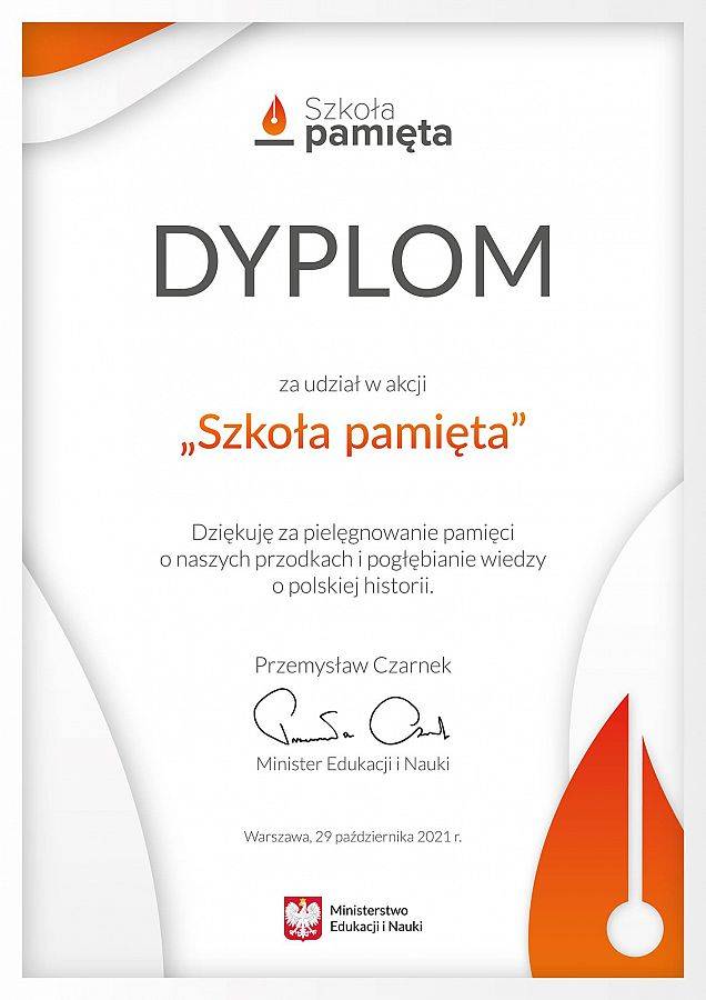 Otrzymaliśmy dyplom od Ministra Edukacji i Nauki Przemysława Czarnka za włączenie się do akcji „Szkoła pamięta”.