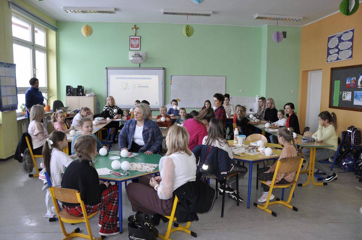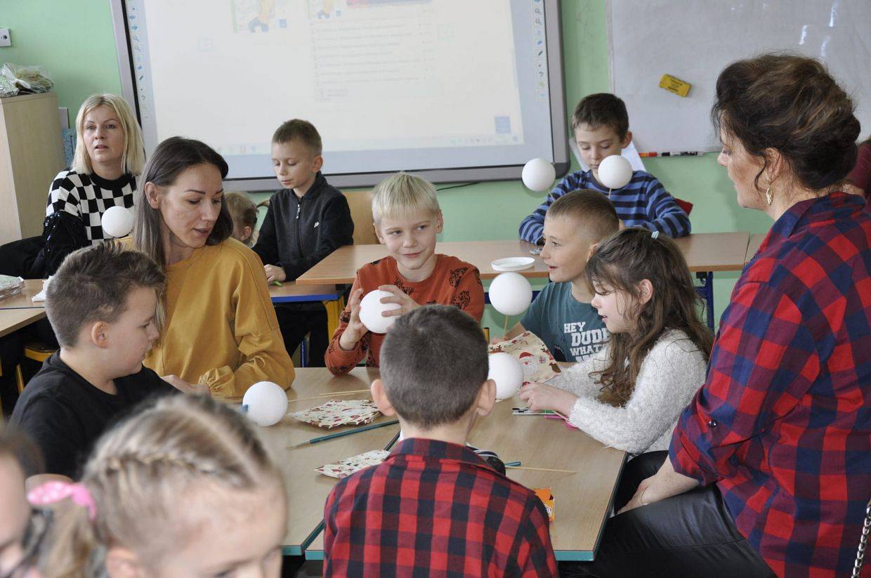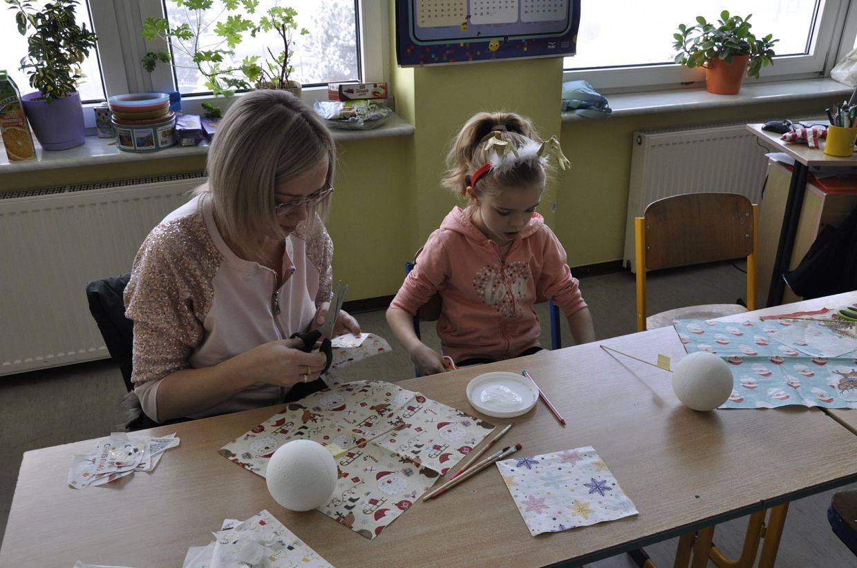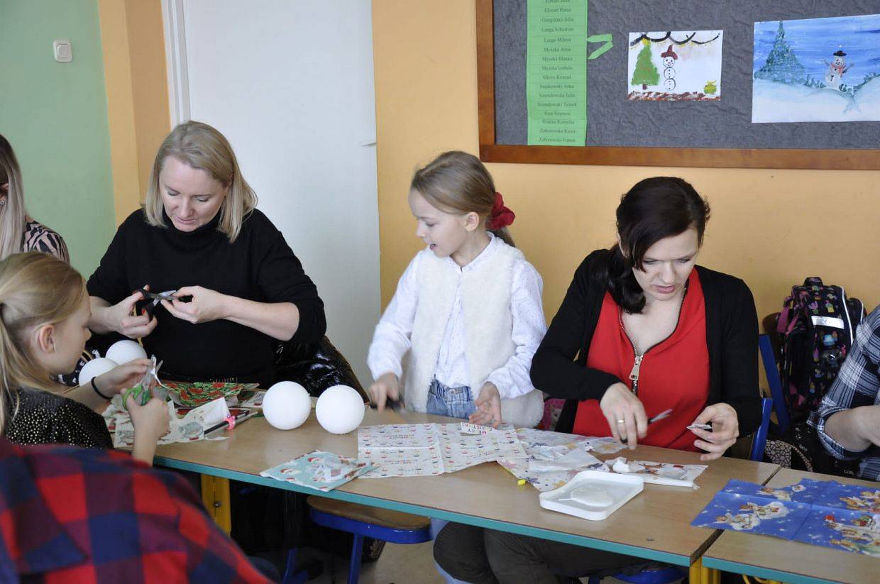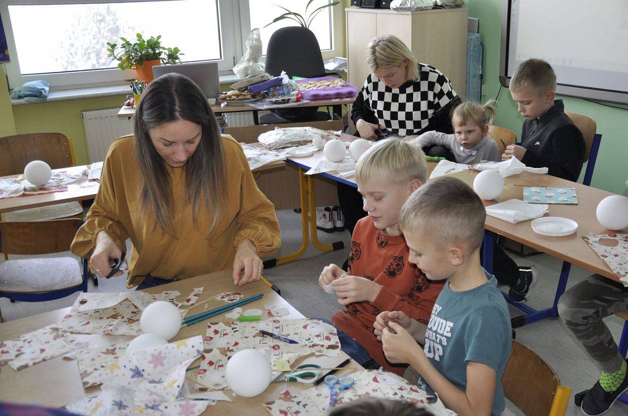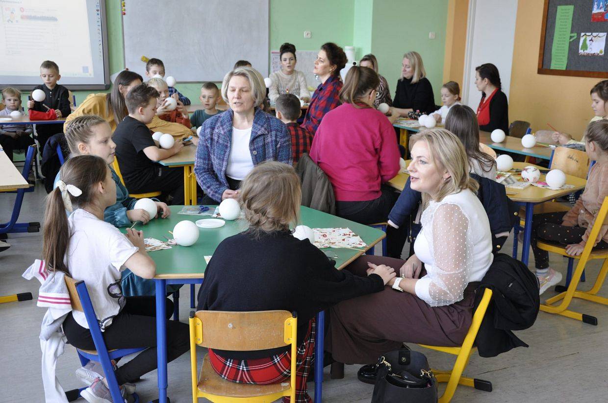 Dnia 9.12.2022r. zajęcia w klasie III poświęcone były przygotowywaniu ozdób świątecznych. W zajęciach tych, oprócz dzieci, uczestniczyły także ich mamy. Każdy z uczestników warsztatów przygotowywał techniką decoupage bombkę. Z nową techniką zapoznała wszystkich pani Sylwia Dawidowska. Po warsztatach dzieci poczęstowały swoje mamy piernikami, które samodzielnie upiekły na lekcjach j. kaszubskiego. Mamy również przygotowały dla dzieci mnóstwo łakoci, tak więc po wytężonej pracy każdy mógł skosztować czegoś słodkiego. Następnie uczniowie zaprezentowali swoim mamom kilka piosenek z własnym akompaniamentem. Na zakończenie zajęć każdy mógł wykonać sobie pamiątkowe zdjęcie w bożonarodzeniowej scenerii.