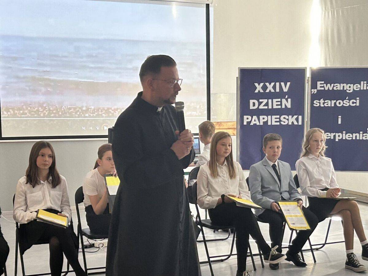 Z tej okazji odbyła się uroczysta akademia, podczas której uczniowie klasy V i VI w montażu słowno-muzycznym przybliżyli na przykładzie życia Jana Pawła II temat starości i cierpienia.