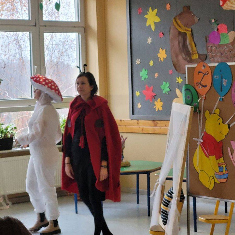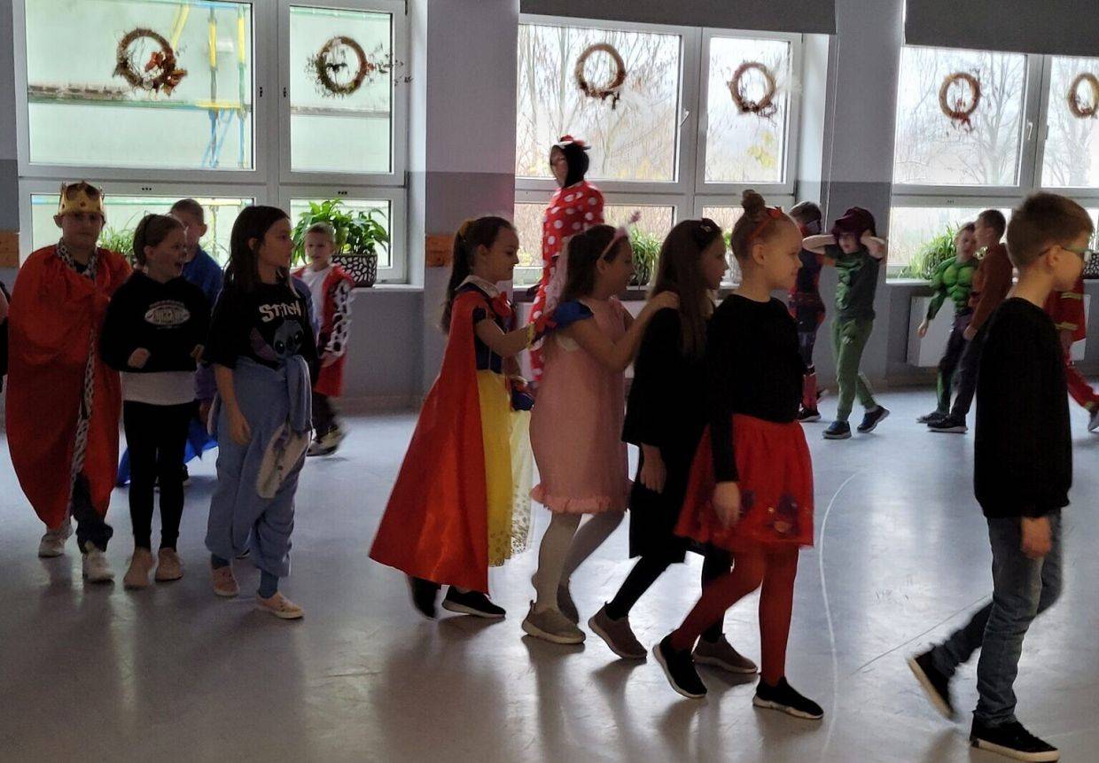 Uczniowie klas I-III, ubrani w piękne stroje, uczestniczyli w różnych tematycznych zadaniach i zabawach oraz w bajkowej gimnastyce do melodii “Wyginaj śmiało ciało”. Podczas kolorowego i wesołego korowodu zaprezentowali swoim starszym kolegom piękne stroje. Jednak największą atrakcją dla dzieci był “Bajkowy Teatrzyk”, w którym miały okazję obejrzeć inscenizację wiersza Jana Brzechwy pt. “Żuk” w wykonaniu nauczycieli. Liczne oklaski, które otrzymali nauczyciele, świadczyły o tym, że występ bardzo dzieciom się podobał.