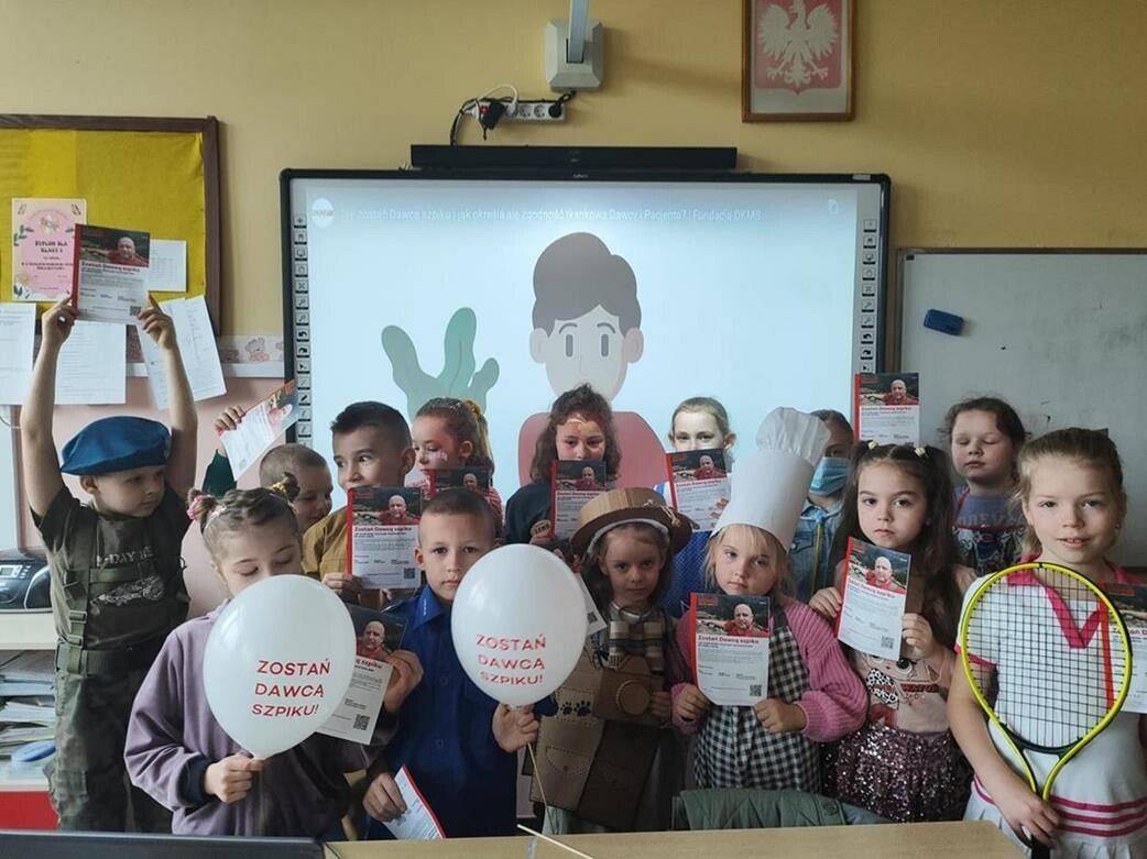 Uczniowie dowiedzieli się kto to jest dawca szpiku, jak można zostać bohaterem i pomóc komuś, kto bardzo tego potrzebuje. Zachęcaliśmy do rozmowy z rodzicami, rozdawaliśmy ulotki, promując dzień rejestracji. Dzięki działaniom udało się uwrażliwić uczniów na problemy osób chorych na nowotwory krwi.