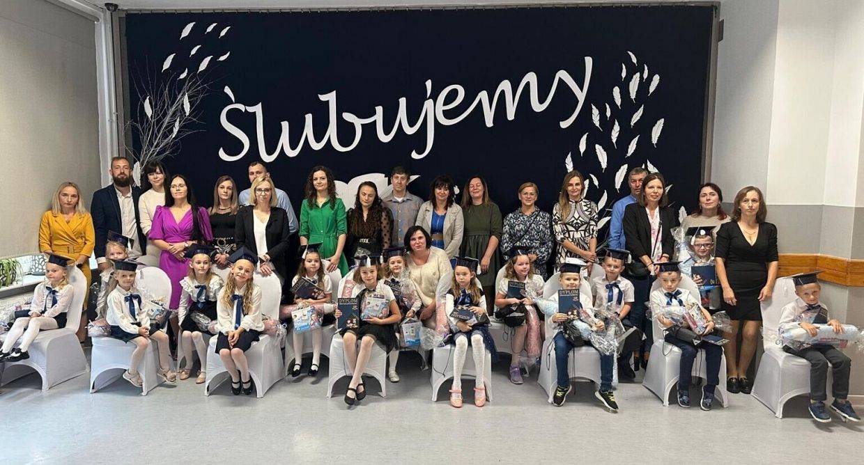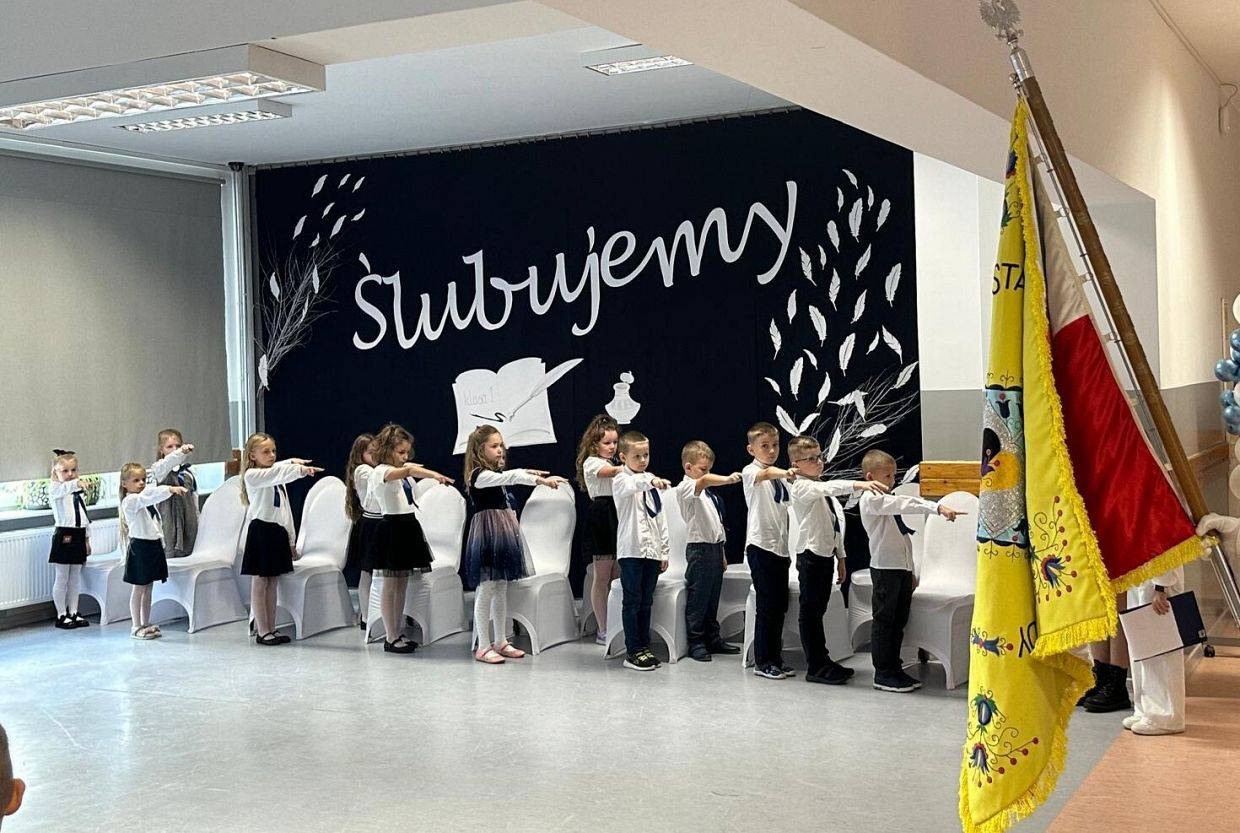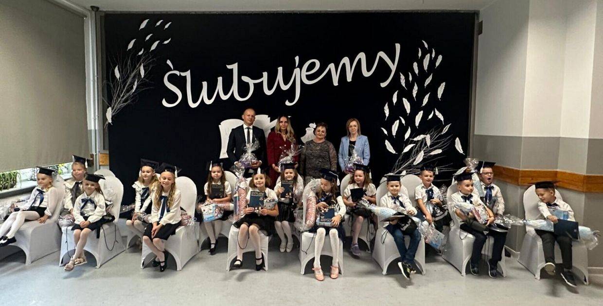 W niezwykle podniosłej atmosferze, przed sztandarem szkoły pierwszacy ślubowali być dobrymi Polakami, godnie reprezentować swoją szkołę, swym zachowaniem i nauką sprawiać radość rodzicom i nauczycielom. Po złożeniu ślubowania pani dyrektor dokonała pasowania na ucznia. „Pasuję Cię na ucznia” – mówiła dotykając dużym ołówkiem – jak czarodziejską różdżką ramion swoich podopiecznych. Następnie uczniowie otrzymali życzenia sukcesów w nauce i mnóstwo prezentów. Rodzice zorganizowali również słodkie przyjęcie.