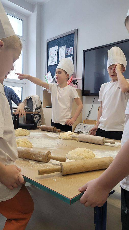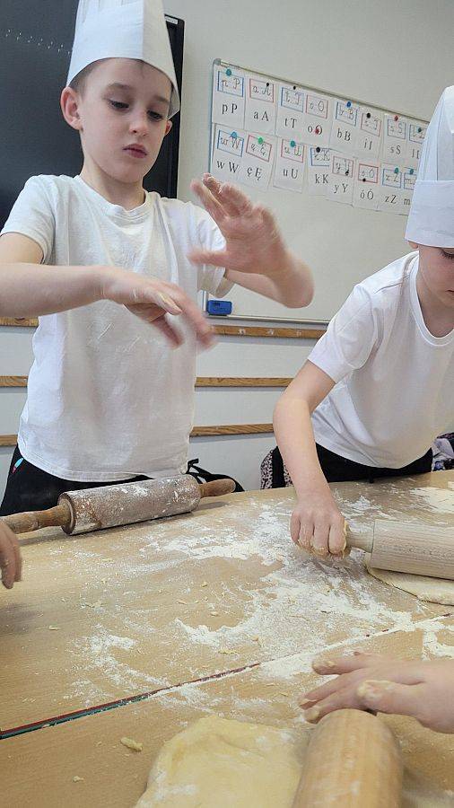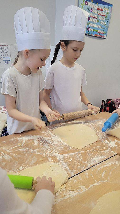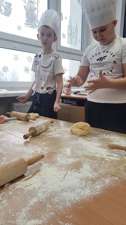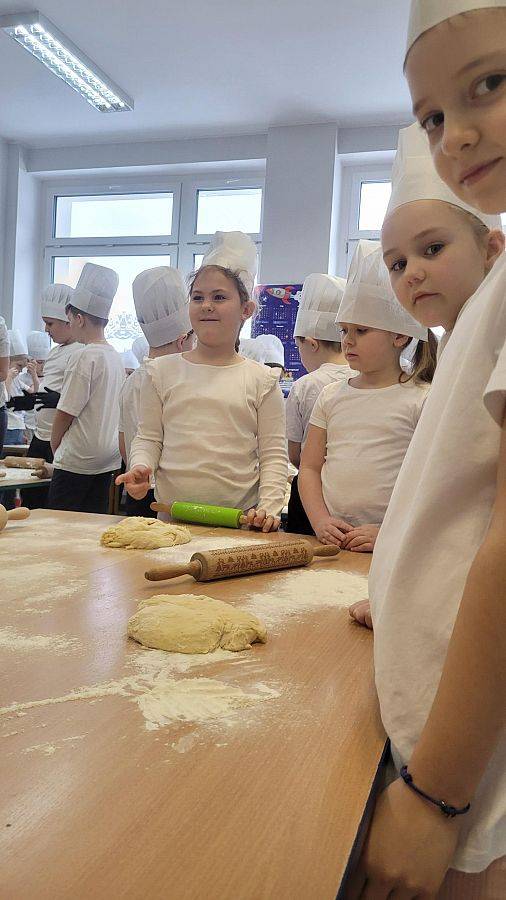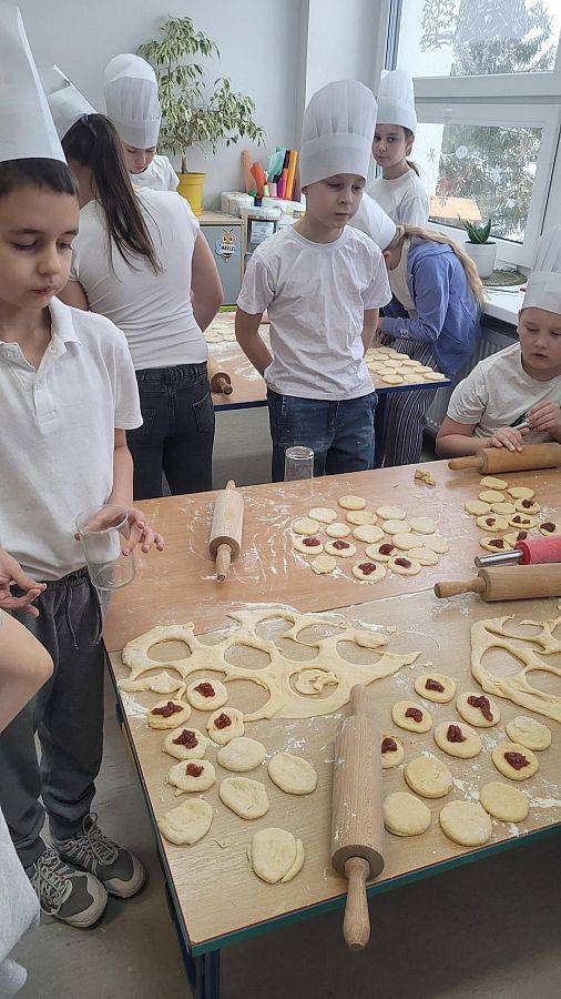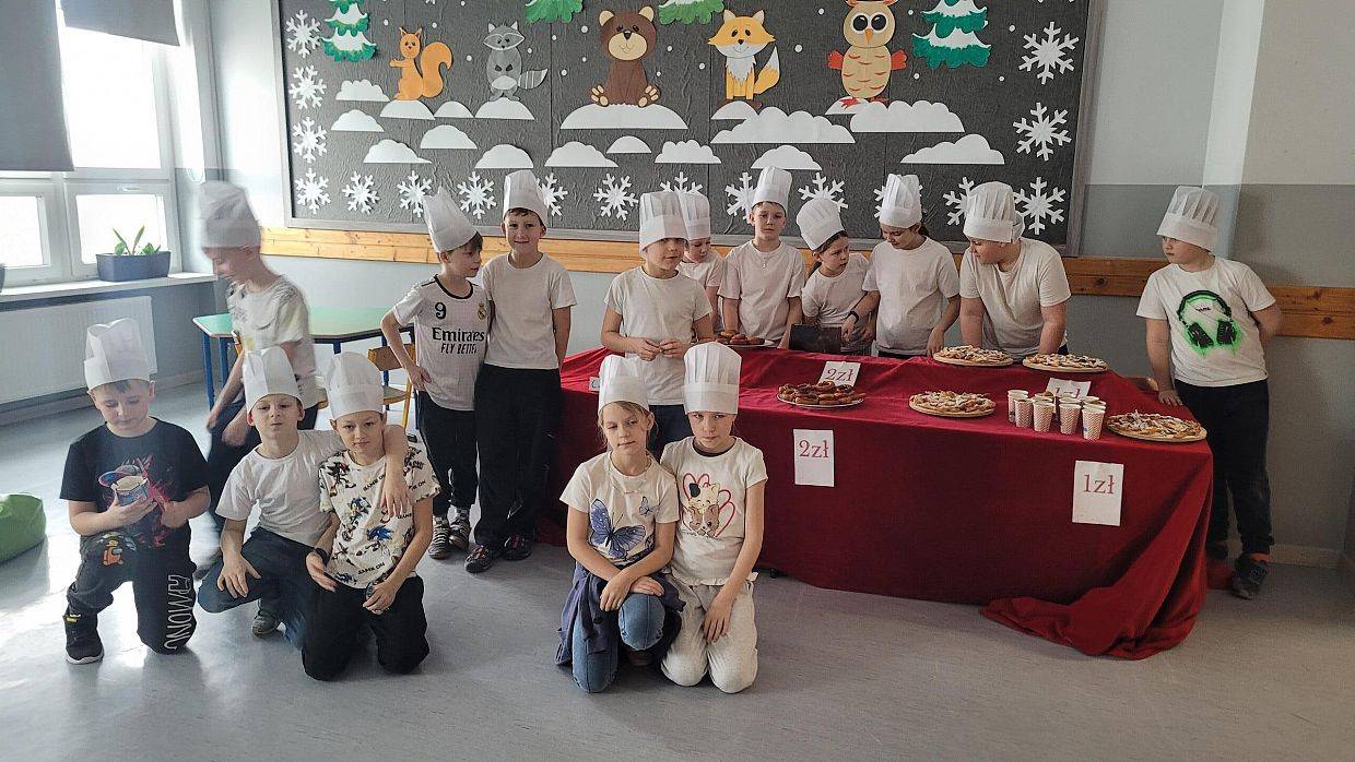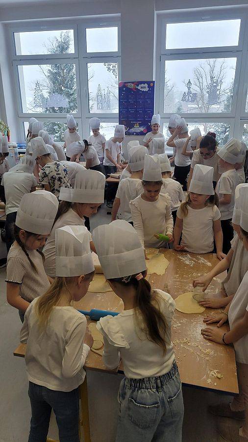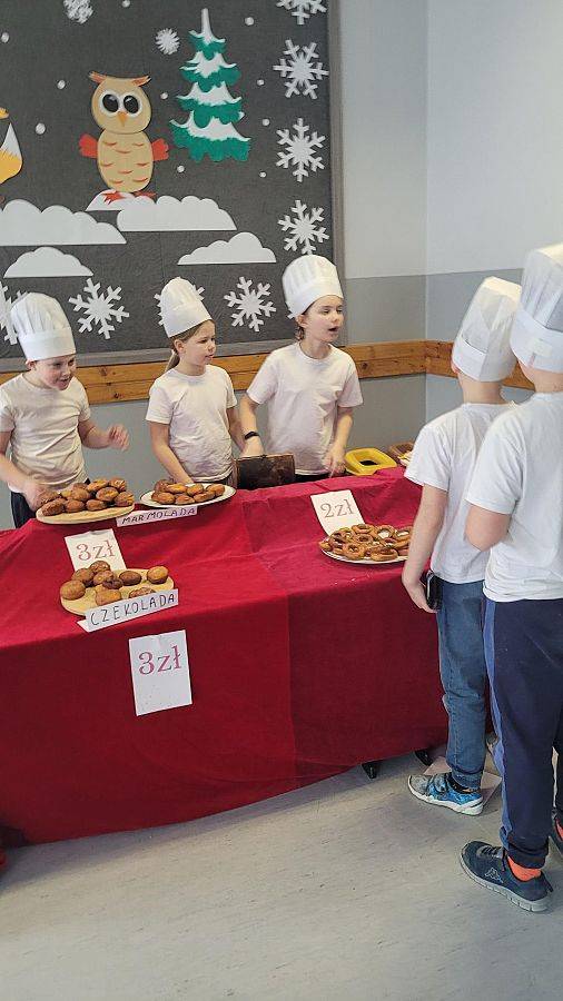 10 lutego w klasach 1–3 od samego rana panowała wyjątkowa atmosfera! Uczniowie z ogromnym zaangażowaniem zakasali rękawy i zabrali się do ciężkiej pracy. Na szkolnym holu unosiły się cudowne zapachy świeżych pączków, pączusiów, donatów i chrupiących faworków.