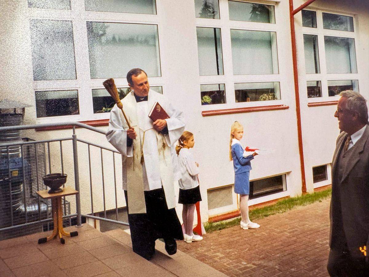 Ksiądz Andrzej Kmiecik — proboszcz parafii w Strzepczu poświęcił salę, a następnie przedstawiciele władz, nauczycieli i uczniów przecięli wstęgę otwierającą nową salę gimnastyczną.