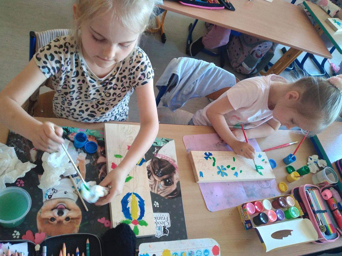 Podczas lekcji języka kaszubskiego dzieci malowały tradycyjne kaszubskie wzory na drewnianych deseczkach.