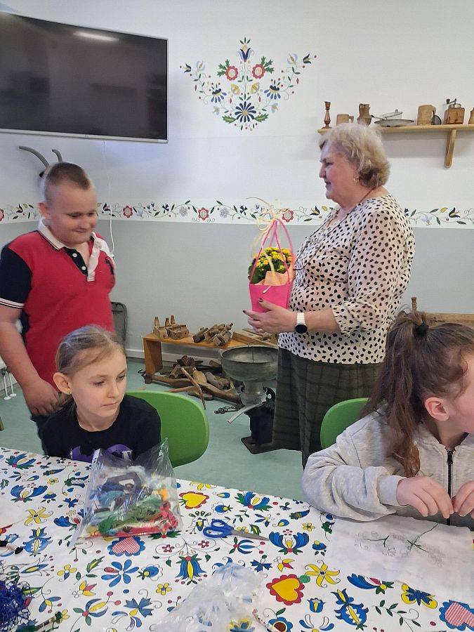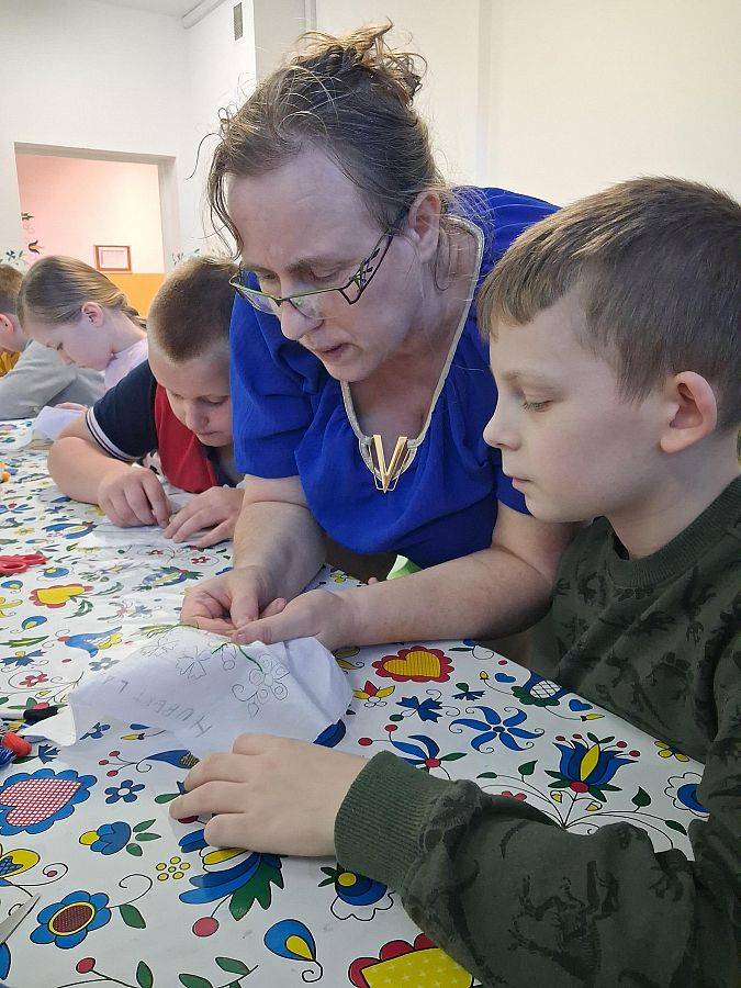 W warsztatach pomagały mieszkanki naszej gminy: pani Irena Janca, pani Grażyna Ellwart oraz pani Teresa Myszka, które chętnie dzieliły się swoją wiedzą i doświadczeniem. Dzięki ich wskazówkom uczniowie mogli poznać tajniki tej pięknej, regionalnej sztuki.