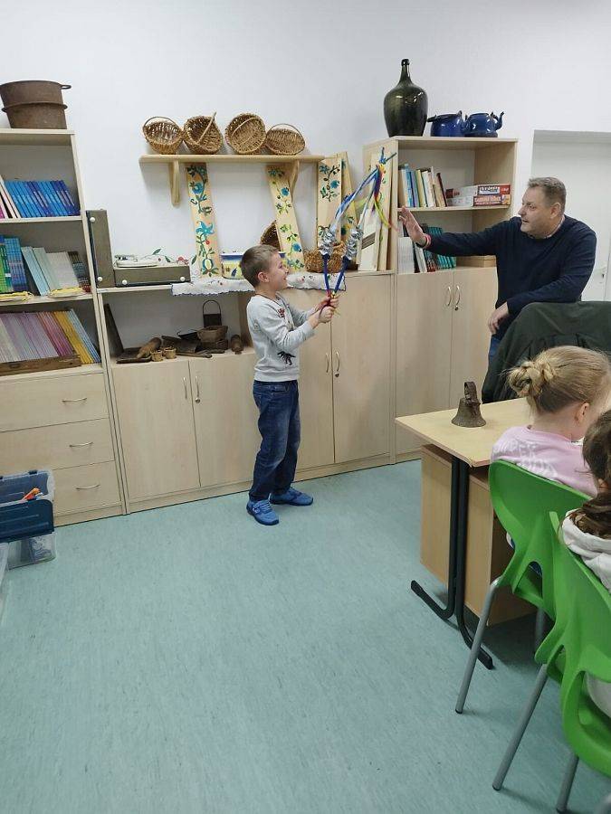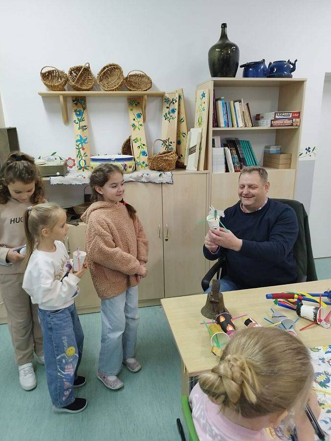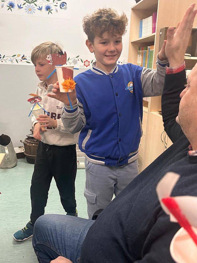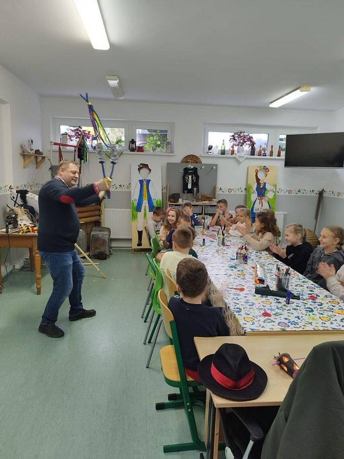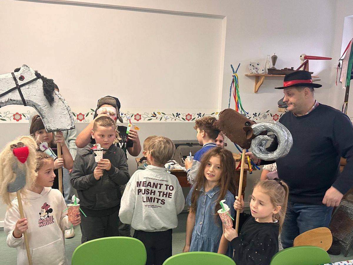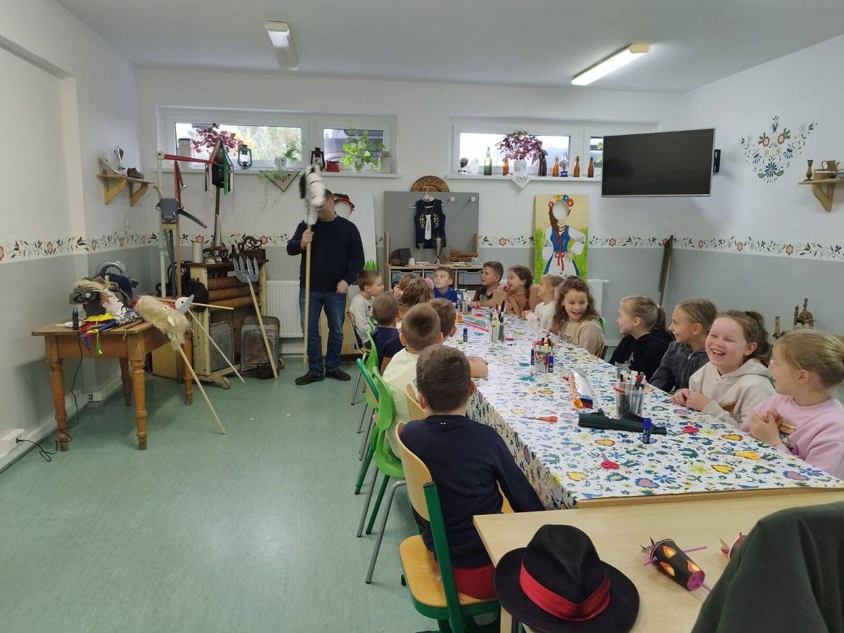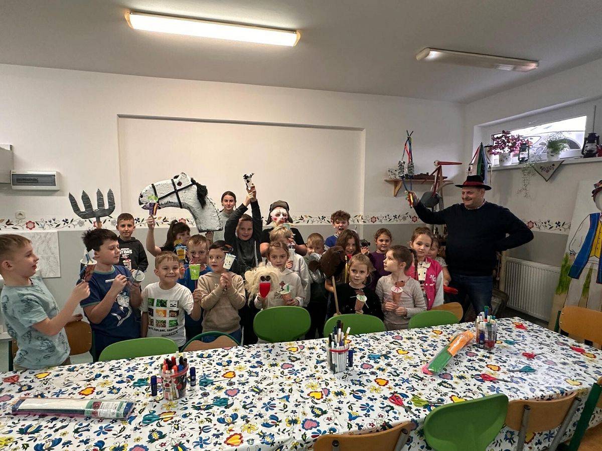 Uczniowie klas I–III podczas lekcji języka kaszubskiego wzięli udział w wyjątkowych warsztatach prowadzonych przez Romana Drzeżdżona – kaszubskiego pisarza i popularyzatora kultury regionu. Zajęcia poświęcone były tradycyjnym kaszubskim Gwiżdżom, znanym również jako maszkary. Dzieci poznały historię tych charakterystycznych postaci, ich rolę w lokalnych zwyczajach oraz ich wygląd.
