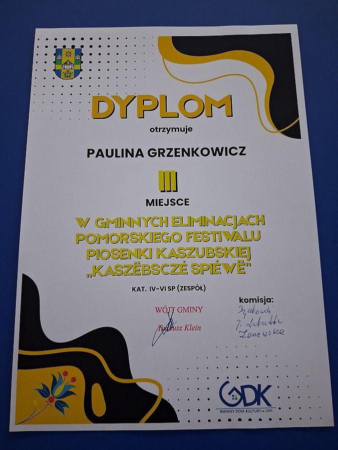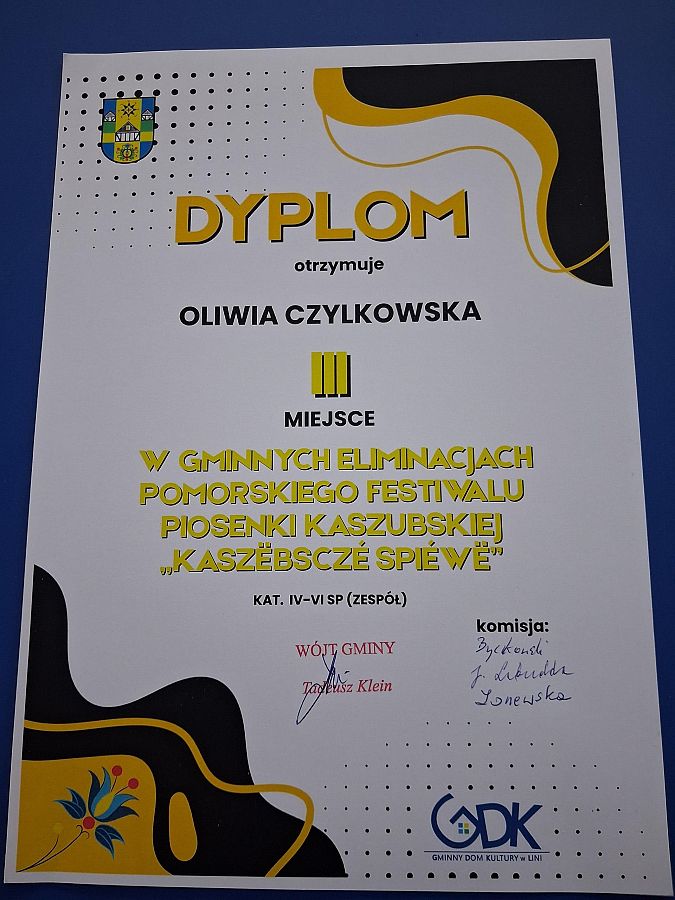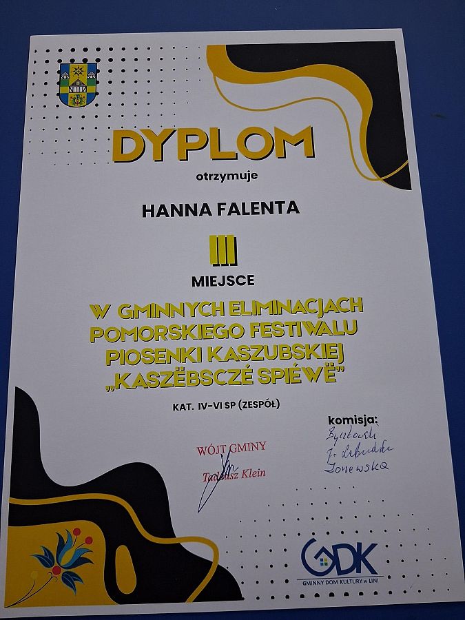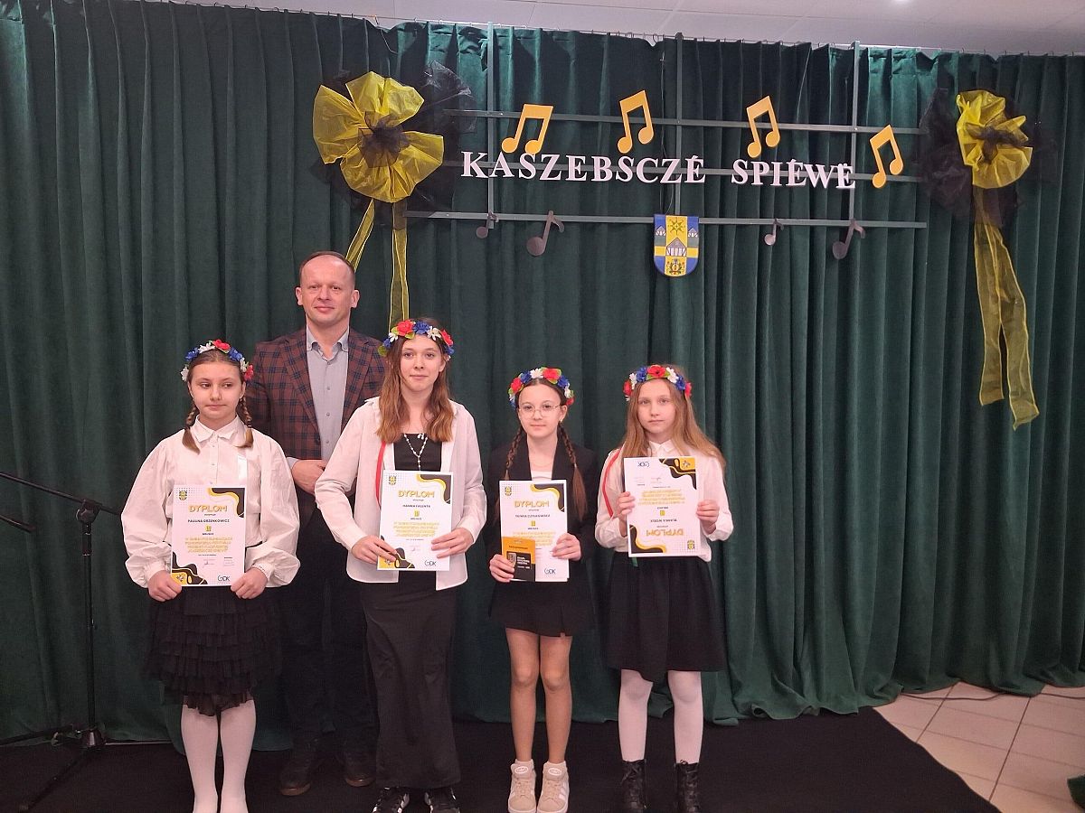Naszą szkołę z dumą reprezentowały: Oliwia Czylkowska, Hanna Flenta, Paulina Grzenkowicz oraz Blanka Woelk. Uczennice wykonały kaszubskie utwory „Hej, tu ù nas, na Kaszëbach” oraz „Tu je nasza zemia”, które w piękny sposób podkreślają przywiązanie do małej ojczyzny, tradycji i regionalnej tożsamości.