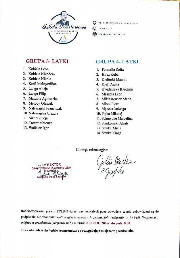 - Rodzice dzieci, które uczęszczają już do przedszkola — składają deklarację o kontynuowaniu wychowania przedszkolnego w Szkole Podstawowej w Strzepczu. Brak deklaracji lub złożenie jej po terminie jest równoznaczne z rezygnacją z przedszkola. Jeśli wystąpiły jakieś zmiany (np. adres zamieszkania) należy do deklaracji dołączyć odpowiednie załączniki.